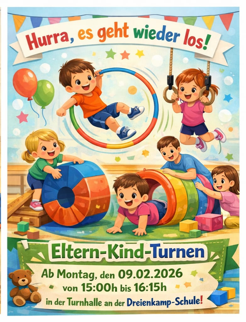 Ab 09.02.2025 starten wir Montags wieder mit dem Turnen für Kinder. Los geht´s um 15:00 Uhr mit dem Eltern-Kind-Turnen bis 16:15 Uhr. Gleich im Anschluss startet das Vorschulkinder Turnen, wo die Kinder das erste Mal ohne Elternteil in der Halle turnen können. Das Vorschulkinder Turnen endet um 17:30 Uhr.