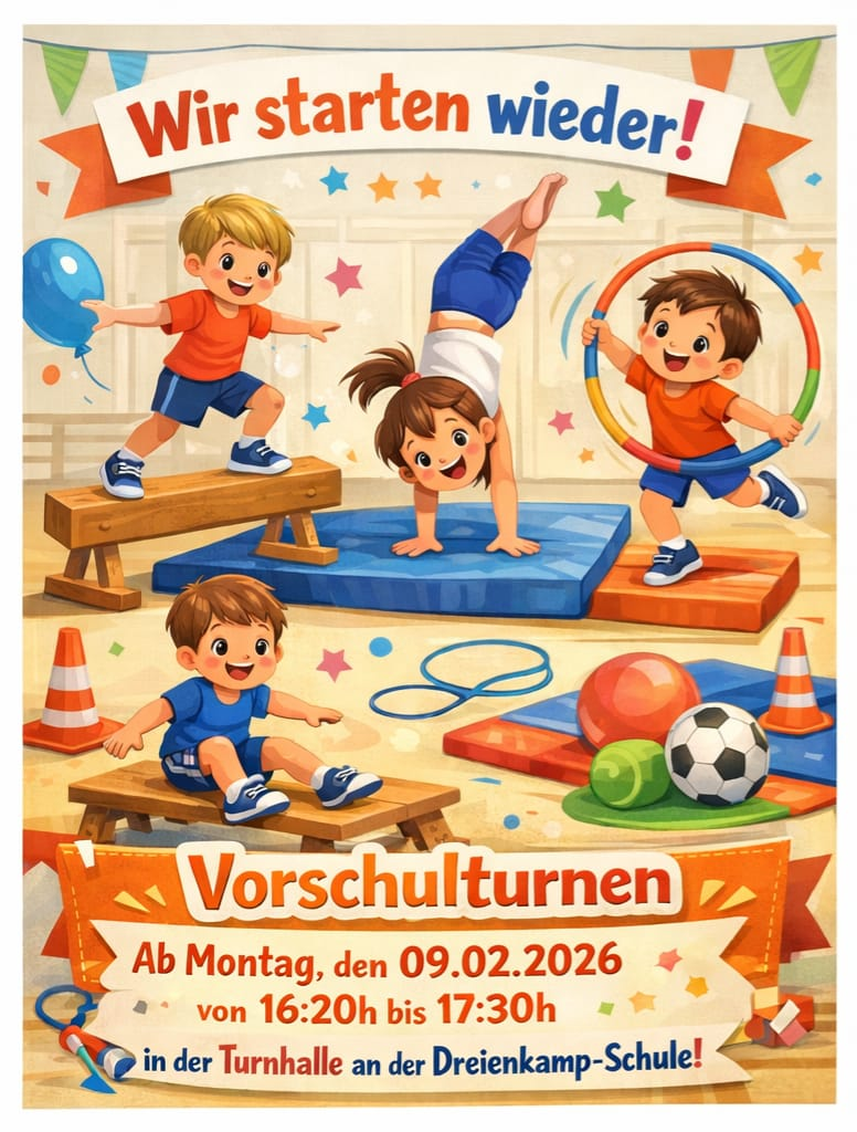 Ab 09.02.2025 starten wir Montags wieder mit dem Turnen für Kinder. Los geht´s um 15:00 Uhr mit dem Eltern-Kind-Turnen bis 16:15 Uhr. Gleich im Anschluss startet das Vorschulkinder Turnen, wo die Kinder das erste Mal ohne Elternteil in der Halle turnen können. Das Vorschulkinder Turnen endet um 17:30 Uhr.